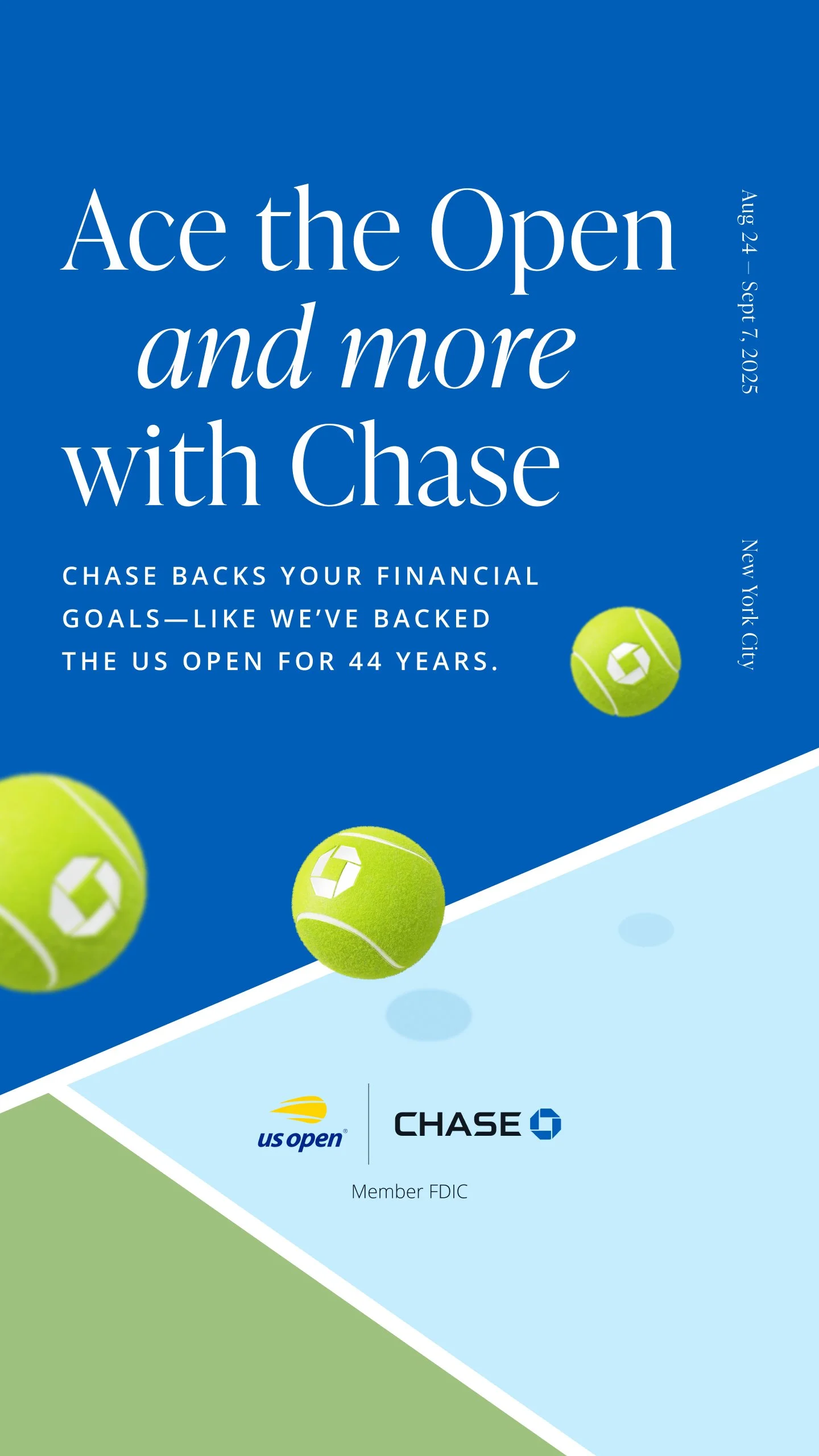 Through my team at Big Spaceship, we partnered with Chase to bring their brand to life across some of the most iconic stages in sports and entertainment. From the US Open Tennis Championships to the halls of Madison Square Garden, I helped art direct, illustrate, and design a suite of graphics spanning out-of-home, video, experiential, and social — blending Chase's polished identity with the electric energy of live sports.